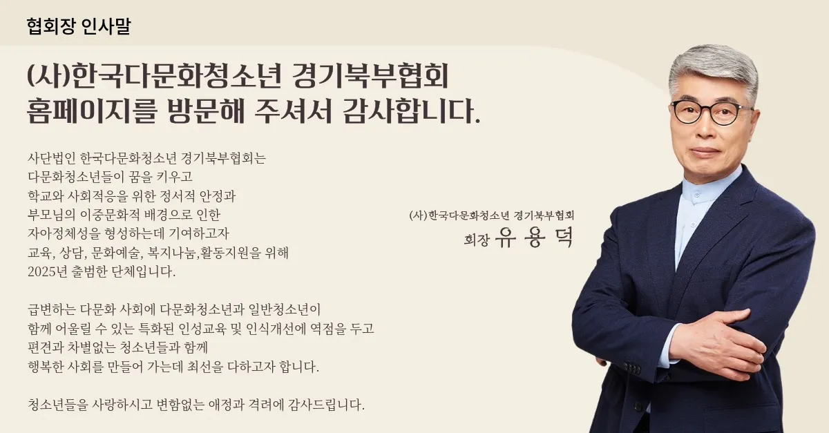 (사)한국다문화청소년 경기북부협회는 2025년 설립된 지역 사회단체로, 다문화 청소년의 성장을 지원하고 미래세대의 건강한 성장을 도모하기 위한 다양한 사회공헌 활동을 펼쳐오고 있다.
