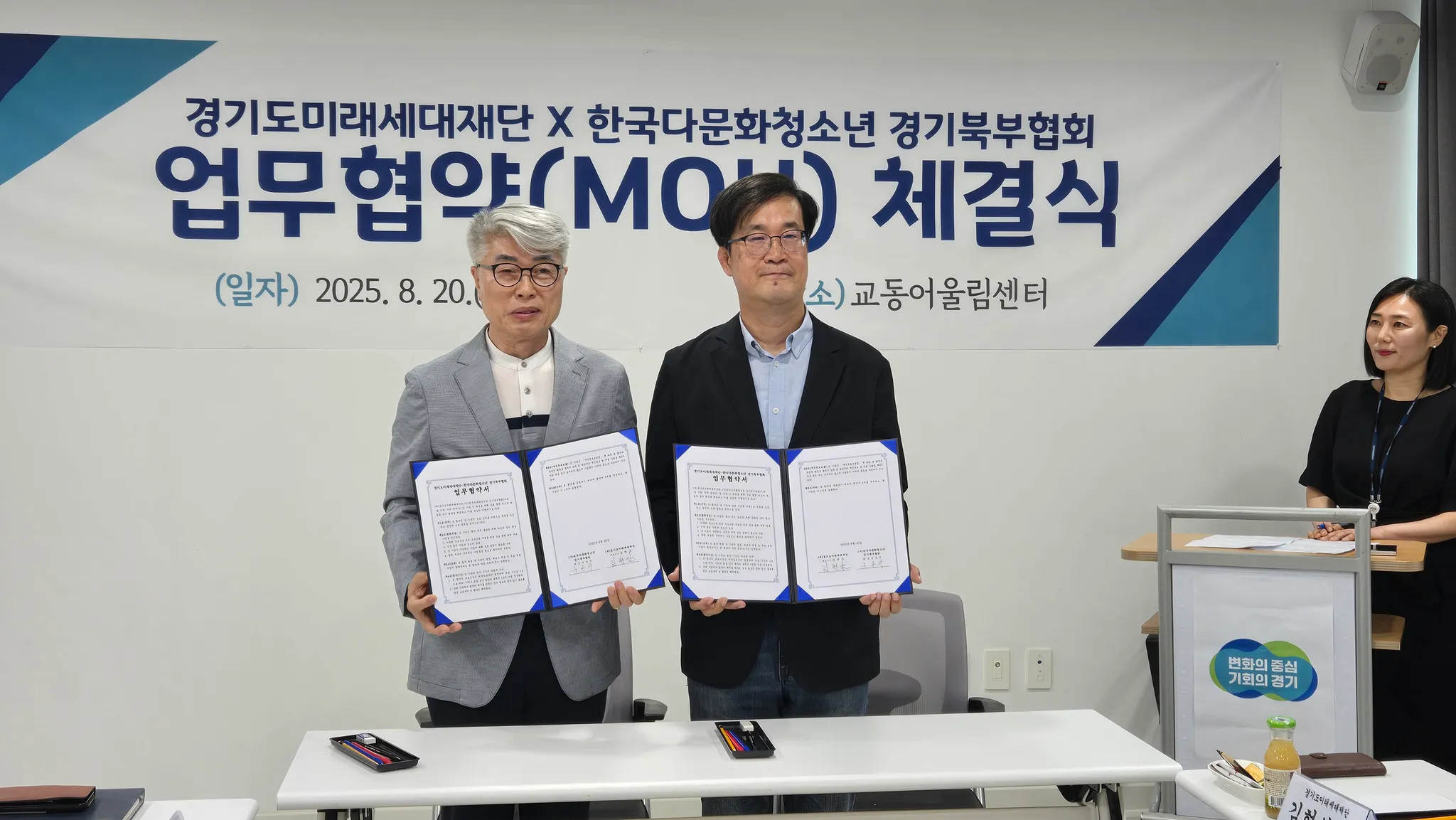 (재)경기도미래세대재단(원장 김현삼)과 (사)한국다문화청소년경기북부협회(회장 유용덕)는 2025년 8월 20일, 다문화 청소년의 성장을 지원하고 지역사회 미래세대의 건강한 성장을 도모하기 위한 상호 협력 협약을 체결했다.