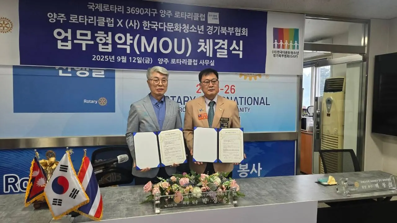 양주로타리클럽과 (사)한국다문화청소년경기북부협회가 12일 지역 다문화 청소년 지원 및 상호 협력 강화를 위한 업무협약(MOU)을 체결했다.